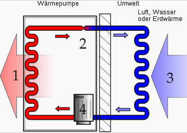 Eine Wärmepumpe ist eine Maschine, die unter Aufwendung von technischer Arbeit thermische Energie aus einem Reservoir mit niedrigerer Temperatur (in der Regel ist das die Umgebung) aufnimmt und – zusammen mit der Antriebsenergie – als Nutzwärme auf ein zu beheizendes System mit höherer Temperatur (z. B. Raumheizung) überträgt. Der verwendete Prozess ist im Prinzip die Umkehrung eines Wärme-Kraft-Prozesses, bei dem Wärmeenergie mit hoher Temperatur aufgenommen und teilweise in mechanische Nutzarbeit umgewandelt und die Restenergie bei niedrigerer Temperatur als Abwärme abgeführt wird, meist an die Umgebung. Das Prinzip der Wärmepumpe verwendet man auch zum Kühlen (so beim Kühlschrank) während der Begriff „Wärmepumpe“ nur für das Heizaggregat verwendet wird. Beim Kühlprozess ist die Nutzenergie die aus dem zu kühlenden Raum aufgenommene Wärme, die zusammen mit der Antriebsenergie als Abwärme an die Umgebung abgeführt wird.